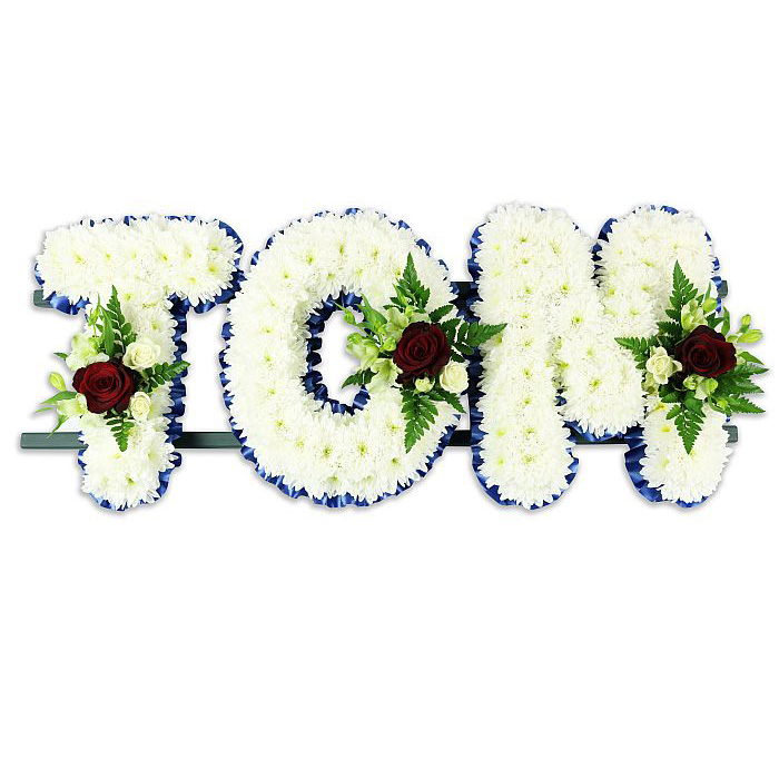 Honour a loved one with the elegant Custom Tom Tribute from Florist Morden. This refined letter tribute is crafted with a base of pure white chrysanthemums, accented by rich red roses and delicate white freesias for a timeless, heartfelt expression of sympathy. Perfect for funerals, memorials and cremation services in Morden and the surrounding areas, it conveys your deepest condolences with premium, fresh flowers.