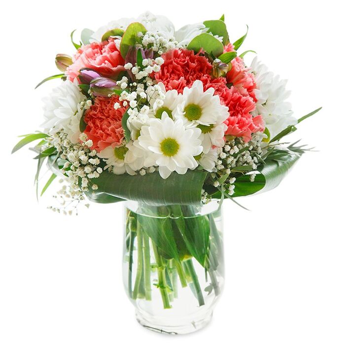 Send a message of love and appreciation with our timeless and elegant flower arrangement. This bouquet combines snow-white chrysanthemums, delicate gypsophila, and light pink carnations, all beautifully accented with rich aspidistra leaves.